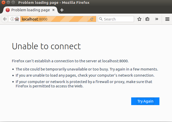$ python function_tests.py Traceback (most recent call last): File "function_tests.py", line 4, in <module> browser.get('http://localhost:8000') File "/home/mang/.pyenv/versions/venv-tdd-goat/lib/python3.6/site-packages/selenium/webdriver/remote/webdriver.py", line 309, in get self.execute(Command.GET, {'url': url}) File "/home/mango/.pyenv/versions/venv-tdd-goat/lib/python3.6/site-packages/selenium/webdriver/remote/webdriver.py", line 297, in execute self.error_handler.check_response(response) File "/home/mango/.pyenv/versions/venv-tdd-goat/lib/python3.6/site-packages/selenium/webdriver/remote/errorhandler.py", line 194, in check_response raise exception_class(message, screen, stacktrace) selenium.common.exceptions.WebDriverException: Message: Reached error page: about:neterror?e=connectionFailure&u=http%3A//localhost%3A8000/&c=UTF-8&f=regular&d=Firefox%20can%E2%80%99t%20establish%20a%20connection%20to%20the%20server%20at%20localhost%3A8000.