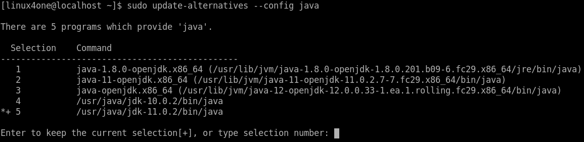 There is 1 choice for the alternative java (providing /usr/bin/java). Selection Path Priority Status --------------------------------------------------------------------------------------- 0 /usr/lib/jvm/java-8-oracle/jre/bin/java 1081 auto mode 1 /usr/lib/jvm/java-8-oracle/jre/bin/java 1081 manual mode * 2 /usr/local/oracle-java-10/jdk-10.0.2/bin/java 1500 manual mode Press to keep the current choice[*], or type selection number: Copy