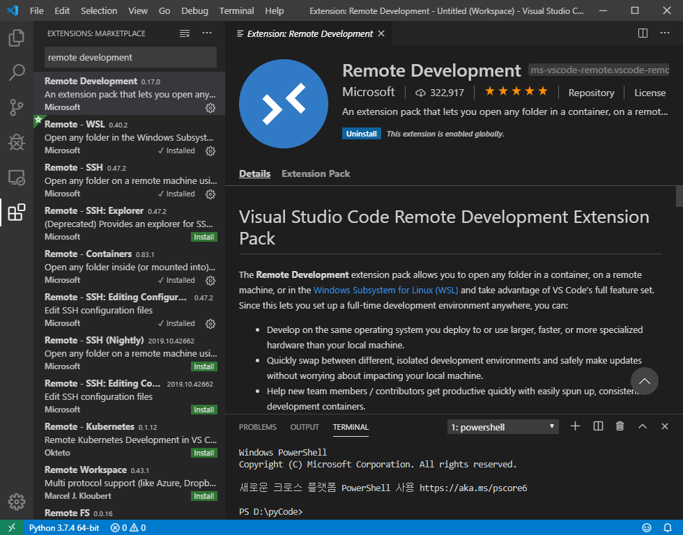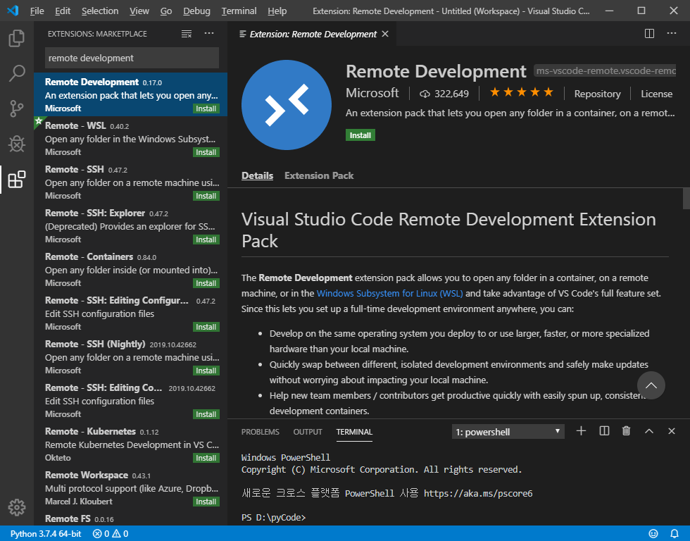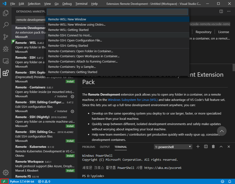 1) VS Code 의 Extensions Marketplace 에 가서 Remote Development 를 Install 한다.