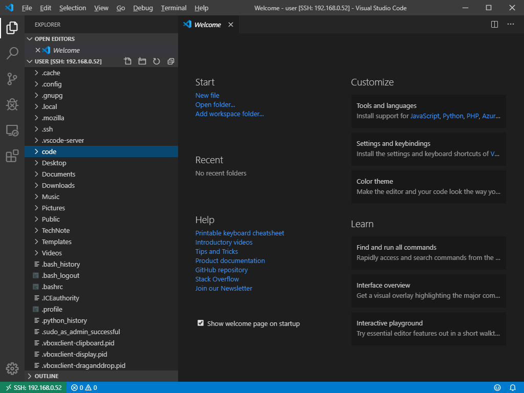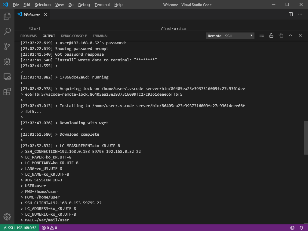 OUTPUT 창을 유심히 본다면 VS Code Server 가 원격 Machine에 설치되어 구동 되고 있다는 로그를 확인할 수 있다.
