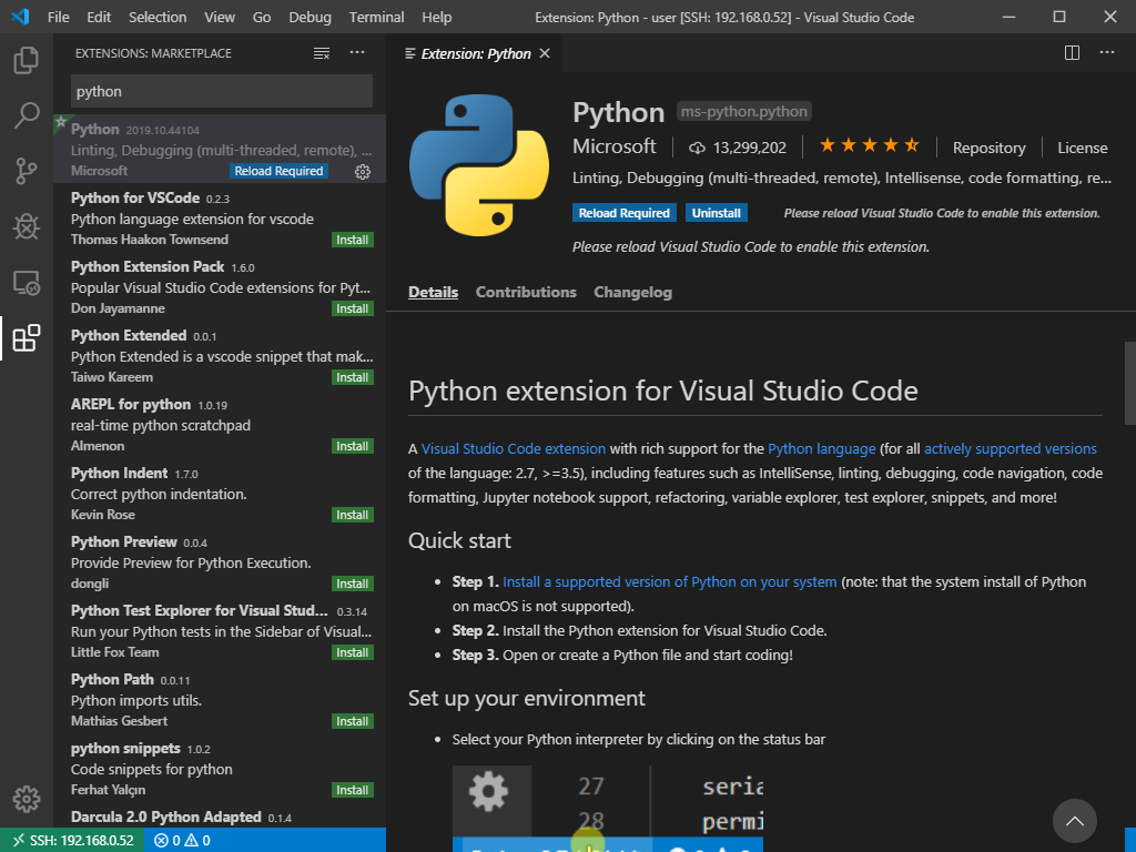 설치가 되면 Reload 가 필요하고 Reload Required 버튼을 누르면 VS Code 가 재실행된다.