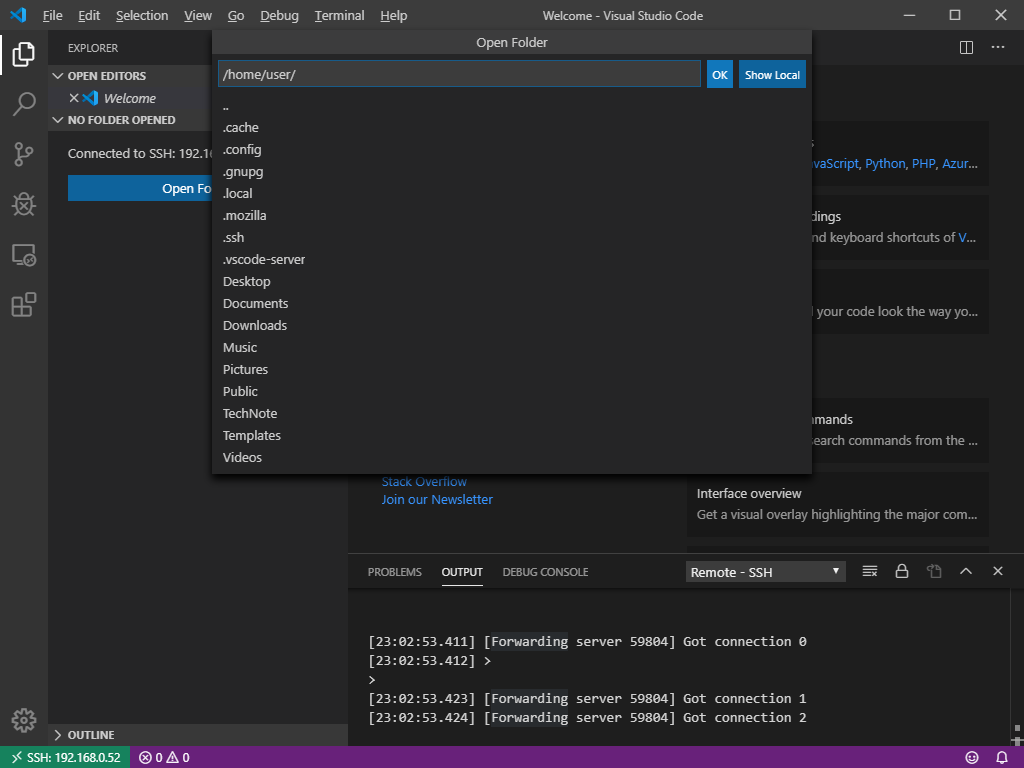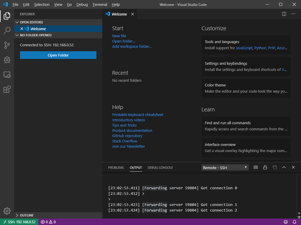 7) 원격에 연결만 되었을 뿐 Workspace에 추가된 Folder가 없으므로 Open Folder 버튼을 눌러 추가한다.