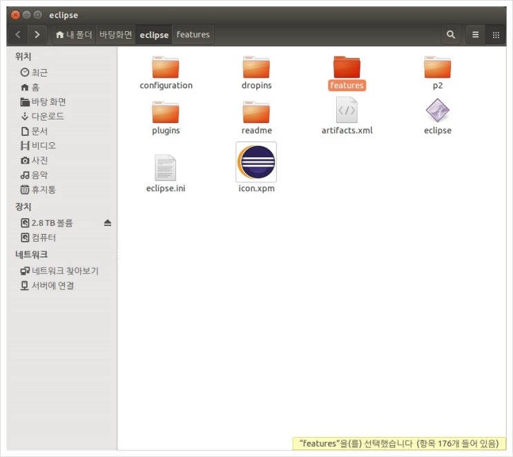 보통 설치파일을 다운받으면 저기 features와 plugins, xml하나 이렇게 세개가 들어있습니다.